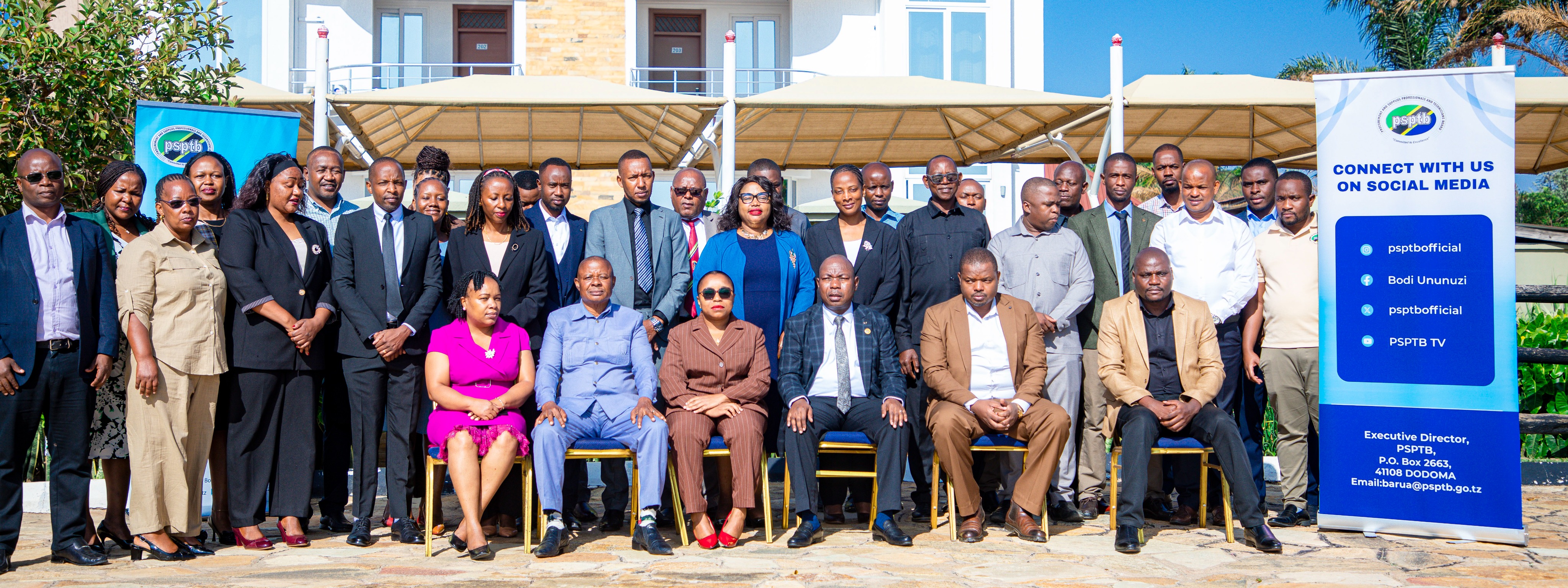 Menejimenti ya PSPTB wakiwa katika picha ya pamoja na meza kuu wakati wa ufunguzi wa Baraza la Wafanyakazi la PSPTB lili...